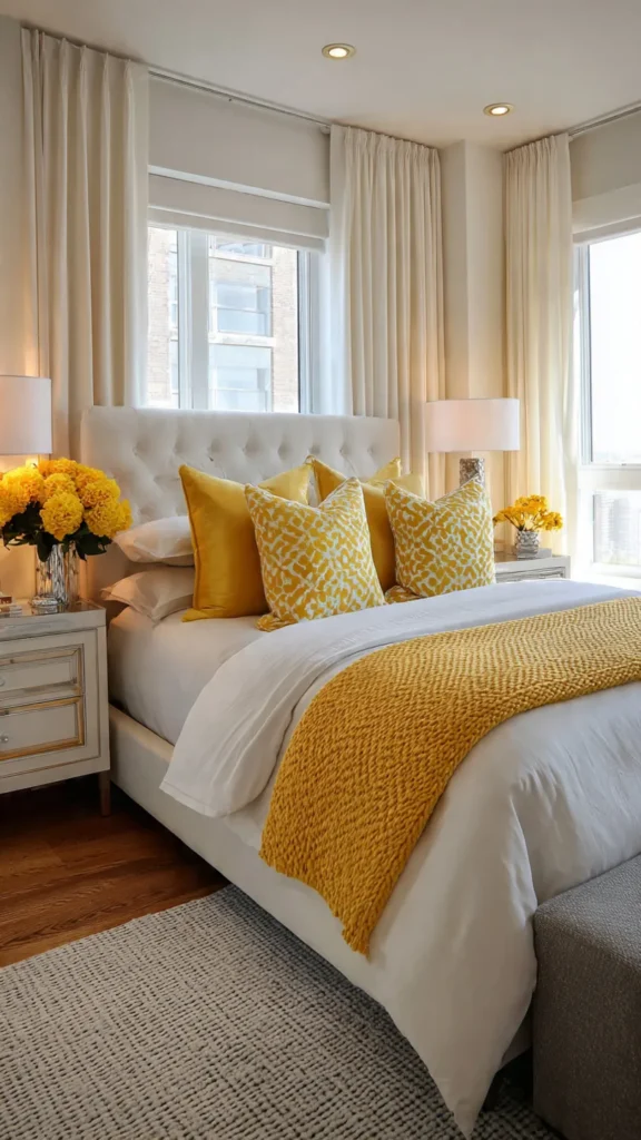 Topaz-inspired gold tones bring warmth and glow into the bedroom. While not as dark as other jewel tones, they still feel rich and sophisticated when layered properly.
