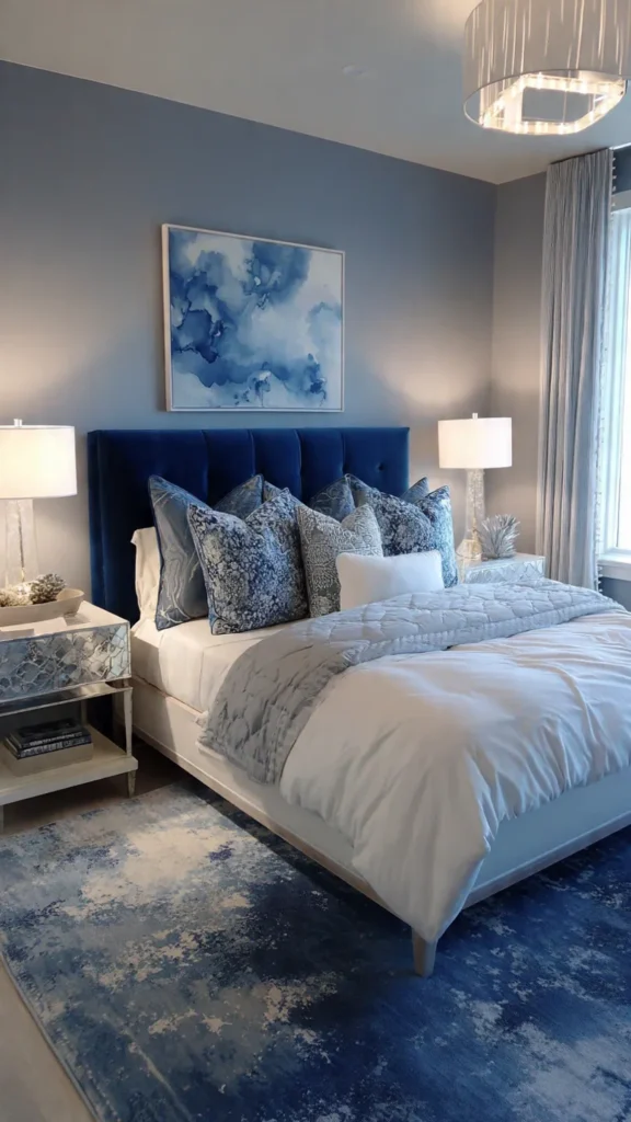 Pair lapis with crisp whites, soft grays, and metallic accents to highlight its depth. This creates a bedroom that feels luxurious, calm, and timeless.