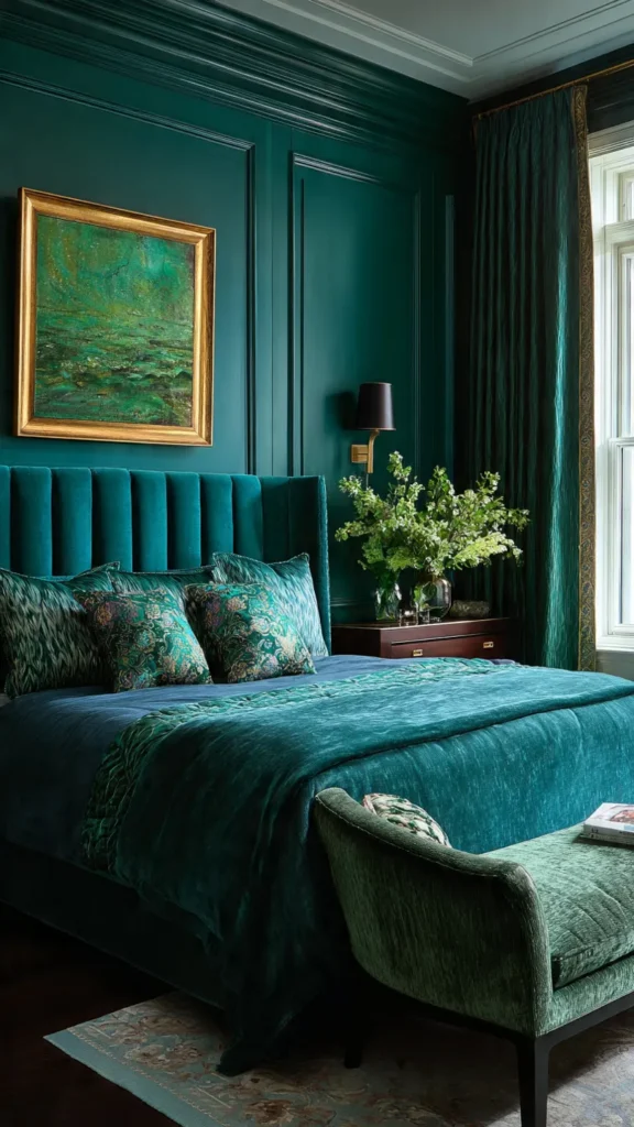 Emerald green instantly makes a bedroom feel lush and elegant. This rich shade reflects the depth of tropical foliage and precious gemstones, giving the room a sense of grandeur without feeling cold or overwhelming. When used on walls, an upholstered headboard, or heavy curtains, emerald creates a dramatic backdrop that still feels calming and grounded.