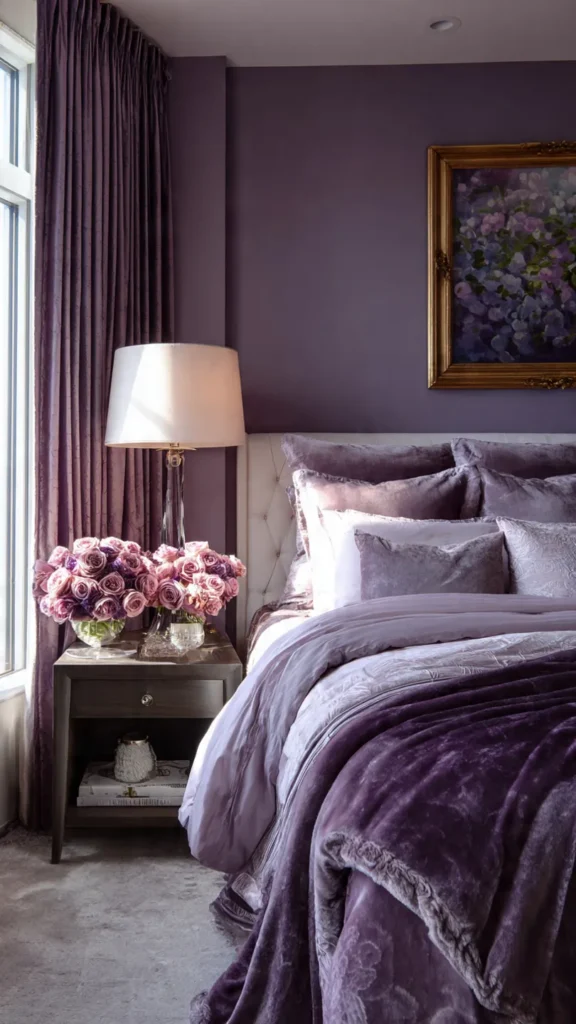 Pair amethyst with muted blush, warm gray, or champagne tones to soften its richness. Velvet textures and layered fabrics enhance its jewel-like quality and turn the bedroom into a warm, intimate retreat.