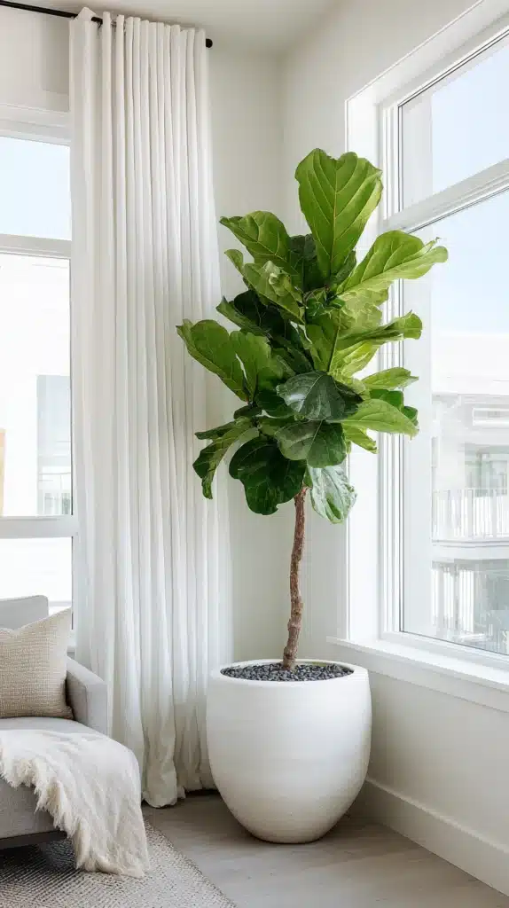 The plant should be genuinely large — undersized plants in oversized corners look hesitant and lost — and the pot should be sized generously enough that the whole composition has visual weight. Add a simple saucer in a complementary material and a thin layer of decorative gravel on the soil surface for a finished, considered look.