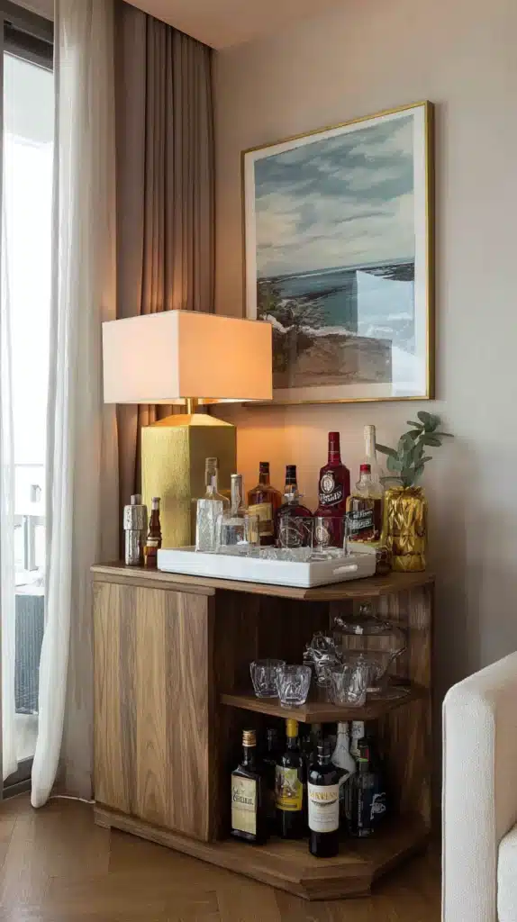 A corner drinks station benefits from being slightly illuminated — LED strip lighting inside a built-in cabinet, or a small lamp on the surface of a corner bar cart — because the warm light on glass and bottle creates an amber glow that draws the eye and gives the corner a distinctly festive, welcoming quality in the evening.