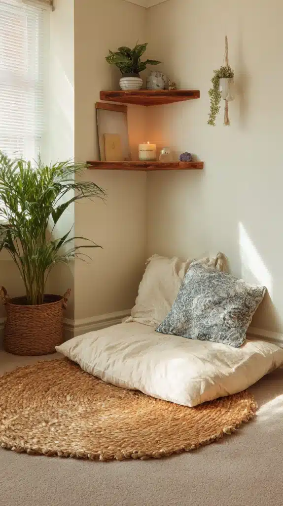 The corner’s natural enclosure on two sides creates the sense of a sheltered, private space within the room, which is precisely what a meditation zone requires.
