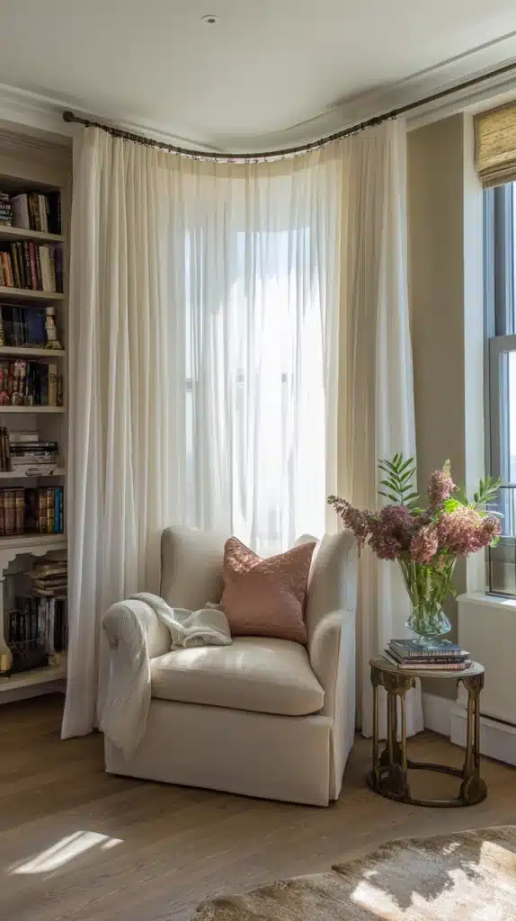 The final and most theatrically ambitious corner idea is the addition of a curtain or canopy treatment that uses the corner’s two-wall geometry to create an enclosed, draped space within the room — a corner canopy that frames the area beneath it with fabric and transforms it into a destination with genuine drama and intimacy.