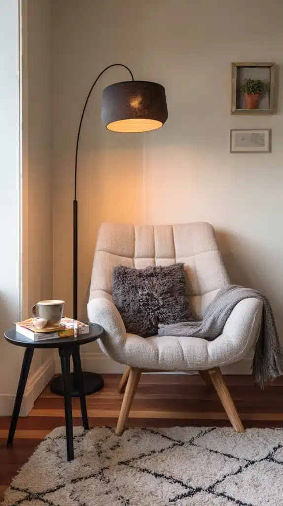 The reading corner — an armchair or small accent chair positioned in a corner with a floor lamp arching over it and a small side table beside it — is one of interior design’s most enduringly useful and most immediately welcoming arrangements, because it creates a destination within the room that has a clear and comfortable purpose. The psychological effect of a lit corner with a chair in it is powerful: the eye is drawn to it, the mind interprets it as an invitation, and guests and family members alike will gravitate toward it instinctively. The floor lamp is the organizing element — it should arch over the chair with enough clearance that reading is comfortable, and it should be at a height and wattage that provides genuinely useful task illumination rather than purely decorative ambient light.