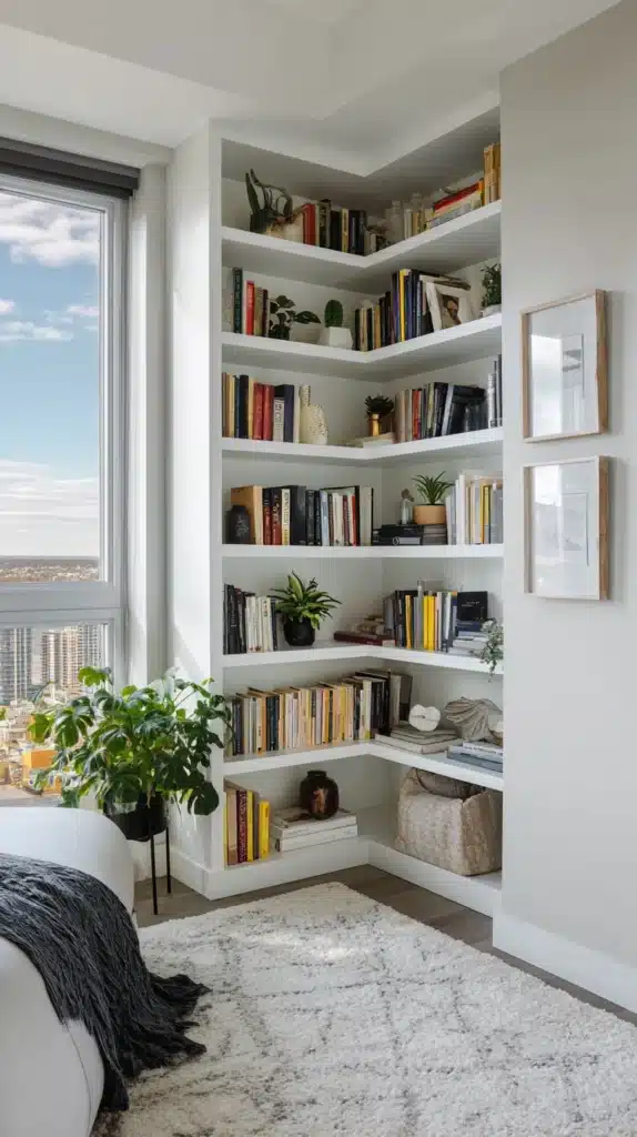A shelving unit designed specifically for corners — the triangular or L-shaped shelf unit that fits precisely into a ninety-degree angle — makes use of space that standard rectangular shelving cannot occupy without projecting awkwardly into the room. Corner shelves can range from a simple set of floating triangular brackets in a staircase corner to a substantial floor-to-ceiling built-in unit that creates a library corner of real architectural presence.