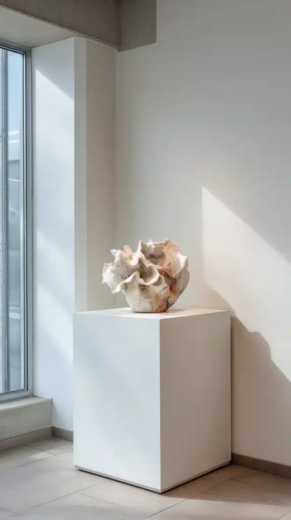 A white plinth or a natural stone or timber pedestal positioned in a corner, with a sculptural object placed on its top surface, creates a corner vignette that has the formal quality of a museum display without the stuffiness — it is simply a beautiful object given the elevation and space it deserves.