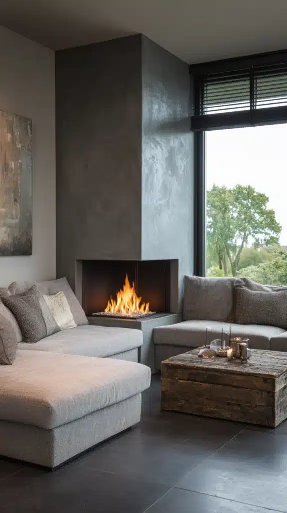 A corner-positioned fireplace or freestanding bioethanol burner transforms the room’s least significant spatial position into its most socially significant one — the place everyone orients toward, the point around which seating naturally arranges itself.