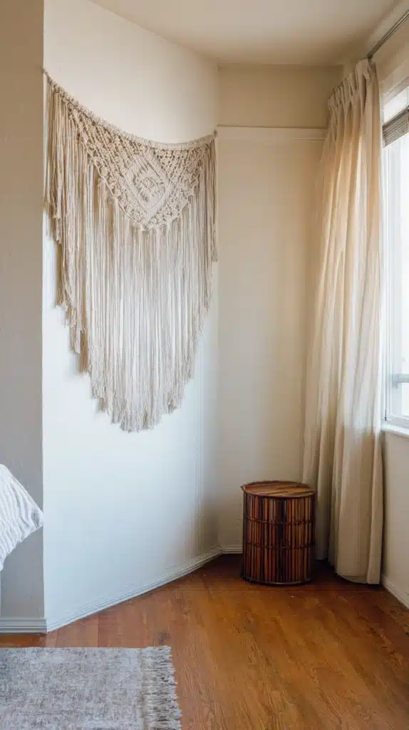 The corner of a room, where two walls meet at a vertical line, creates a natural anchor point for hanging textile art or macramé installations that use the corner’s three-dimensionality rather than simply treating it as a flat surface.