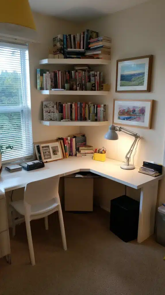 A well-designed corner desk setup should include proper task lighting — a desk lamp or wall-mounted lights on both sides to eliminate the uneven illumination that single-light setups create — organized cable management, and sufficient storage integrated into the desk’s surface or the shelving above it to contain the visual clutter that a workspace generates.