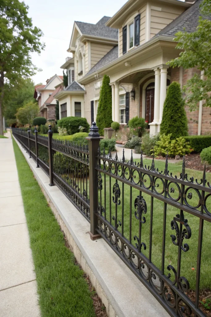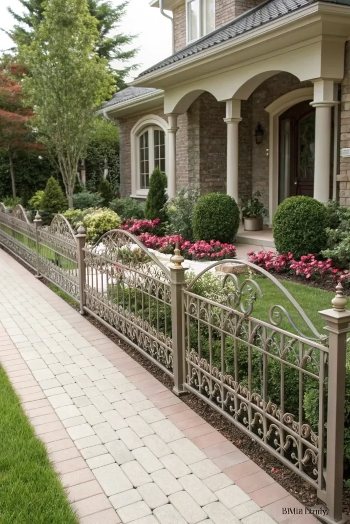 Metal panel fences offer durability and a striking modern aesthetic. Their slim lines and strong structure add a sophisticated touch to your front yard. You can choose between black steel, powder-coated aluminum, or decorative wrought iron for different looks. This style blends beautifully with contemporary, industrial, and transitional homes.