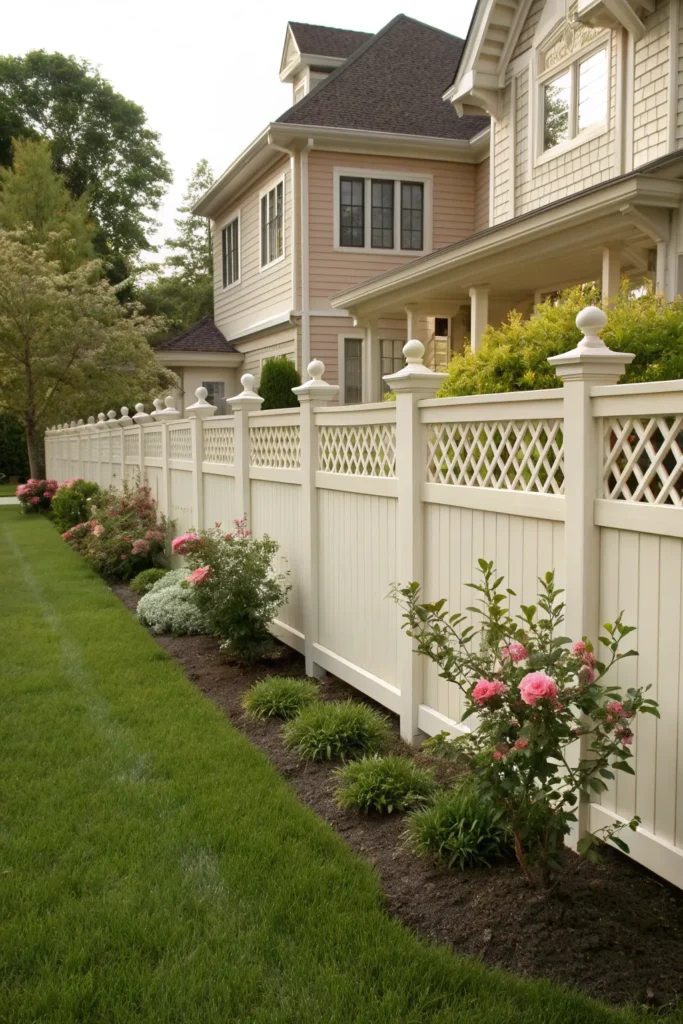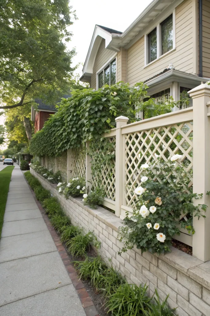 A low lattice-style fence adds textural appeal and visual softness to your front yard. Its crisscross pattern is decorative and airy, making it ideal for cottage-style or garden-focused homes. Lattice designs pair well with climbing plants like jasmine, clematis, or morning glories. As the vines grow, the fence becomes a beautiful living accent.