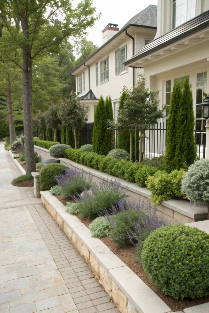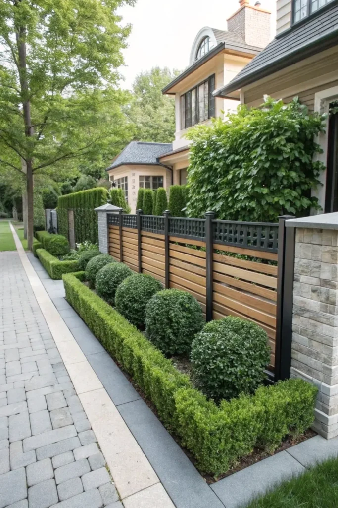 Combining a low fence with greenery creates a lush and layered look. A low wood or metal fence paired with small hedges offers privacy, color, and dimension. Boxwood, privet, and Japanese holly are popular choices because they stay neat and structured. This hybrid style is fantastic for homeowners who want greenery without committing fully to tall hedges.