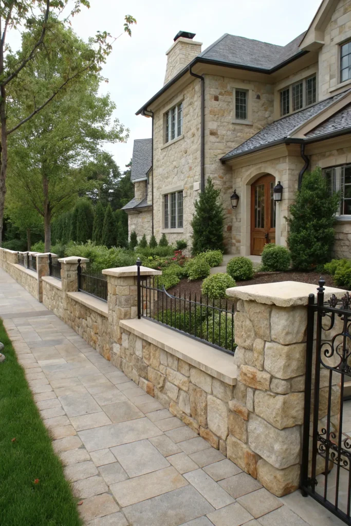 A low stone wall creates a strong, elegant boundary that feels both rustic and refined. The natural texture of stone adds visual interest and durability. Whether you choose stacked stones or smooth, cut stone blocks, this style complements traditional, farmhouse, and European-style homes. Add a small iron gate or planting beds along the wall for added charm.