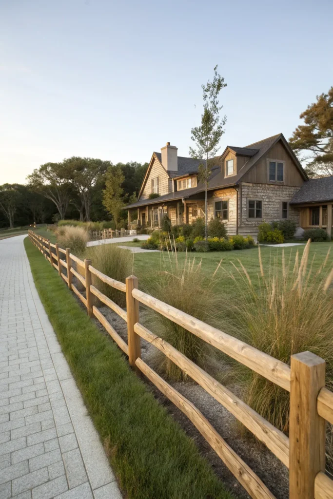 A split rail fence brings a classic country feel to any home. Though simple and open, its rustic character adds warmth and texture to your front yard. This low fence style works particularly well with farmhouse, cabin, ranch, and rural-inspired properties. Surround it with tall grasses, native plants, or wildflowers to complete the organic look.