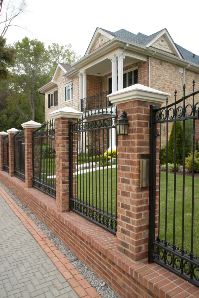 Combining brick columns with low iron panels creates a strong, classic, and high-end look. The brick foundation adds stability, while iron panels provide elegance and openness. This style works beautifully with traditional, colonial, and historic homes. Incorporating matching brick from your house exterior creates a seamless, cohesive appearance.