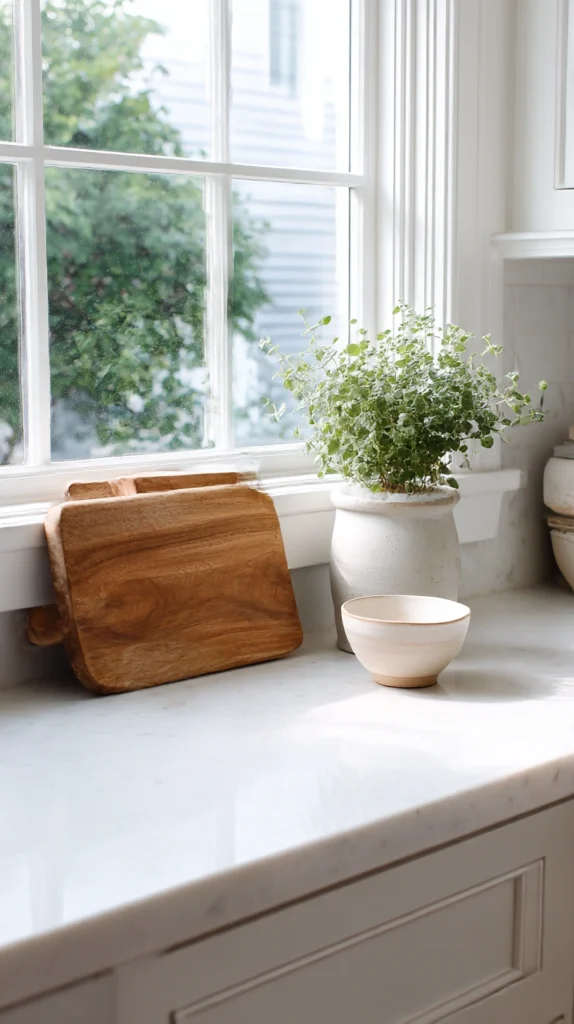 Herb plants cost $2–$5 each from garden centres. Group in a tight cluster at one end of the windowsill rather than spacing evenly — a grouped arrangement reads as intentional kitchen styling rather than a collection of pots that have been placed wherever there was room.