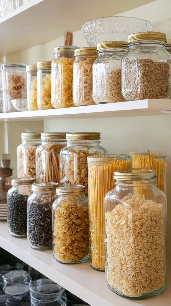 A set of six matching glass storage jars with airtight lids costs $20–$50. Label each jar with a simple chalk label or a small ceramic tag for a detail that takes two minutes to add and significantly improves the readability and finish of the arrangement on the shelf. Keep the jar sizes consistent within each shelf level for the cleanest result.