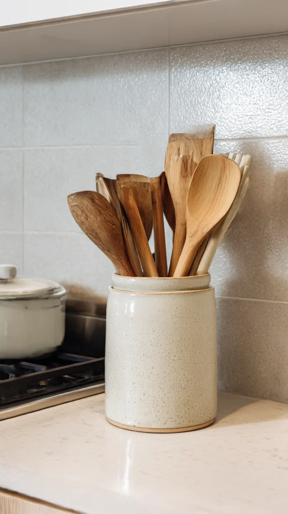 A hand-thrown stoneware utensil crock costs $20–$50. A simple terracotta pot works equally well at $3–$8. Use one container rather than two — a single generous utensil holder is tidier and more visually coherent than a pair of smaller containers holding different categories of tool beside each other.