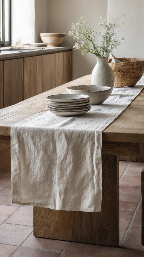 Style tip: Wash the runner before using it for the first time and do not iron it completely flat. A slightly relaxed linen runner with gentle creasing from the wash has the lived-in quality that suits a summer kitchen. An immaculately pressed runner has the quality of something that has just been unpacked — which is the wrong starting point for a kitchen that is meant to feel genuinely inhabited.