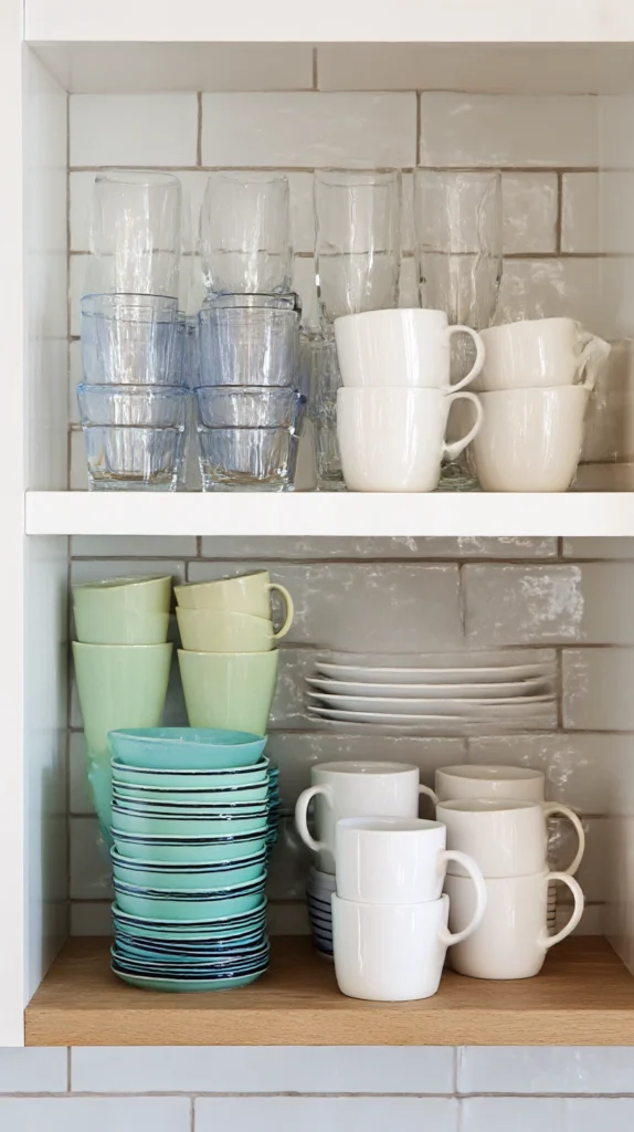 A set of four clear glass tumblers costs $10–$25. Simple white porcelain espresso and coffee cups run $15–$40 for a set of four. The heavy ceramic mugs go into a cupboard for autumn and the lighter pieces take their place on the shelf — the exchange costs almost nothing and shifts the visual character of the kitchen noticeably toward summer.