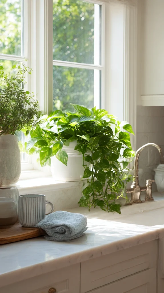 A single well-chosen houseplant in the kitchen — a small pothos on a shelf, a snake plant in a corner, or a trailing string of pearls beside the window — adds the living, organic quality to the room that no decorative object can replicate. Plants make kitchens feel inhabited and cared for in a way that is difficult to articulate and immediately obvious.