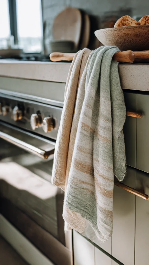 Quality linen tea towels cost $8–$20 each. Two or three hung from the oven handle or folded over a rail in coordinating colours is enough to register as a considered seasonal touch. Choose tones from a narrow palette — all sage green, or all stripe in one colour — rather than a mix of different patterns.