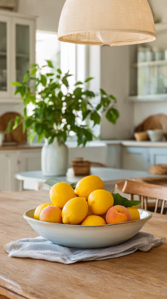 A wide, shallow bowl of seasonal summer fruit — lemons and limes, a pile of peaches, a mound of figs, or a mix of stone fruits — on the kitchen table or counter is one of the oldest and most reliably effective kitchen decor ideas available. It is functional, it smells good, and it changes with the season automatically.