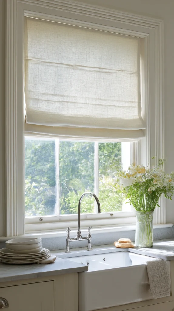 Replacing heavy curtains or dark kitchen blinds with white or cream Roman blinds lets summer light into the kitchen in a way that nothing else matches at the equivalent cost. The clean, flat surface of a Roman blind in a natural fabric reads as architectural rather than decorative and suits the practical, uncluttered quality a kitchen window requires.