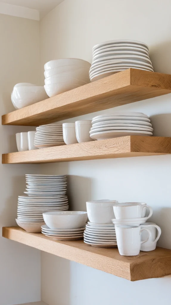 Floating timber shelves cost $20–$50 each to buy and install. A simple set of white ceramic dinnerware for four costs $40–$100. The arrangement works only if the dishware is consistent — mixed patterns and colours on open shelving read as disorganised rather than curated. Simplicity is non-negotiable for this to look right.