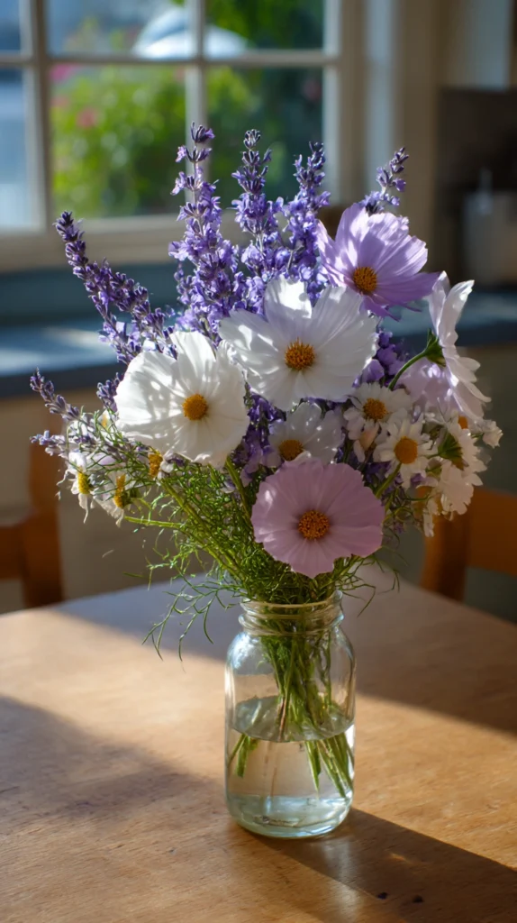 A bunch of whatever is flowering in the garden — cosmos, sweet peas, lavender, or a handful of herb flowers — in a single simple vase on the kitchen table or windowsill brings more life and colour into the kitchen than any purchased decorative object of equivalent cost. It takes five minutes, lasts a week, and costs nothing if the garden provides it.