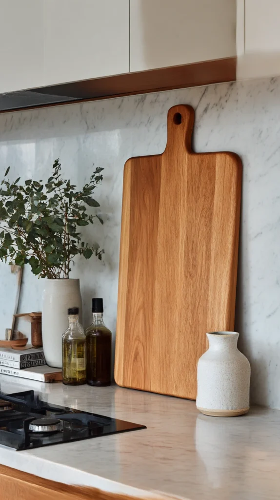 A large, well-oiled wooden chopping board leaned against the kitchen splashback or propped beside the hob — whether in use or simply displayed — is one of the most naturally warm and most kitchen-appropriate styling objects available. It adds the texture and colour of natural wood to a surface that is often dominated by hard, uniform materials.