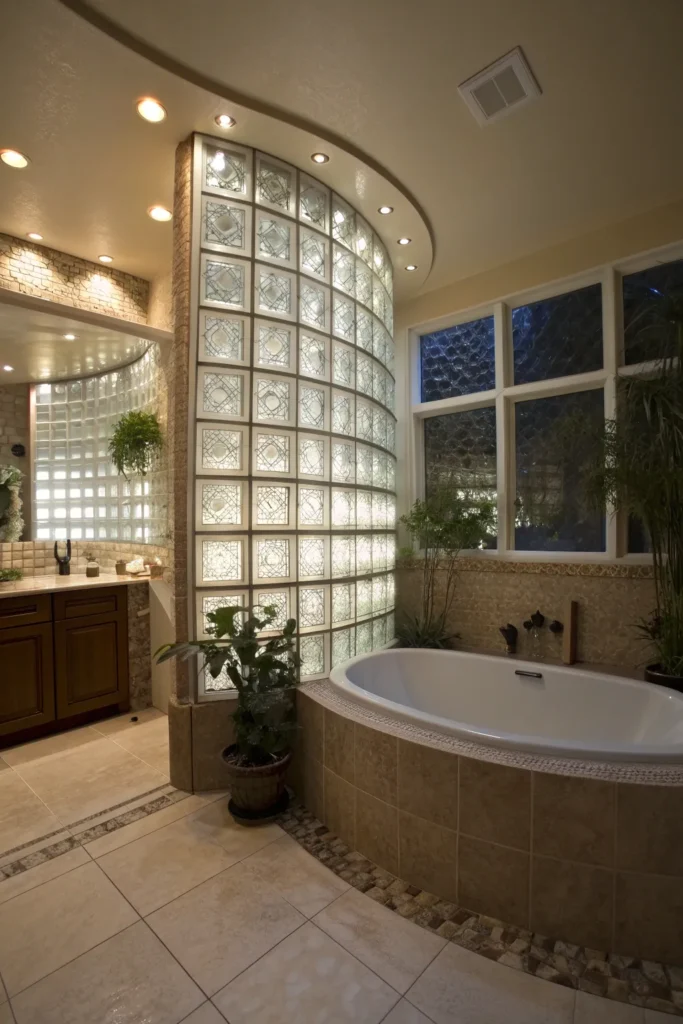 Create a unique tub-shower combo enclosure using curved glass block walls that provide privacy while allowing light transmission, creating interesting visual effects and architectural interest that serves as a bathroom focal point while maintaining openness.