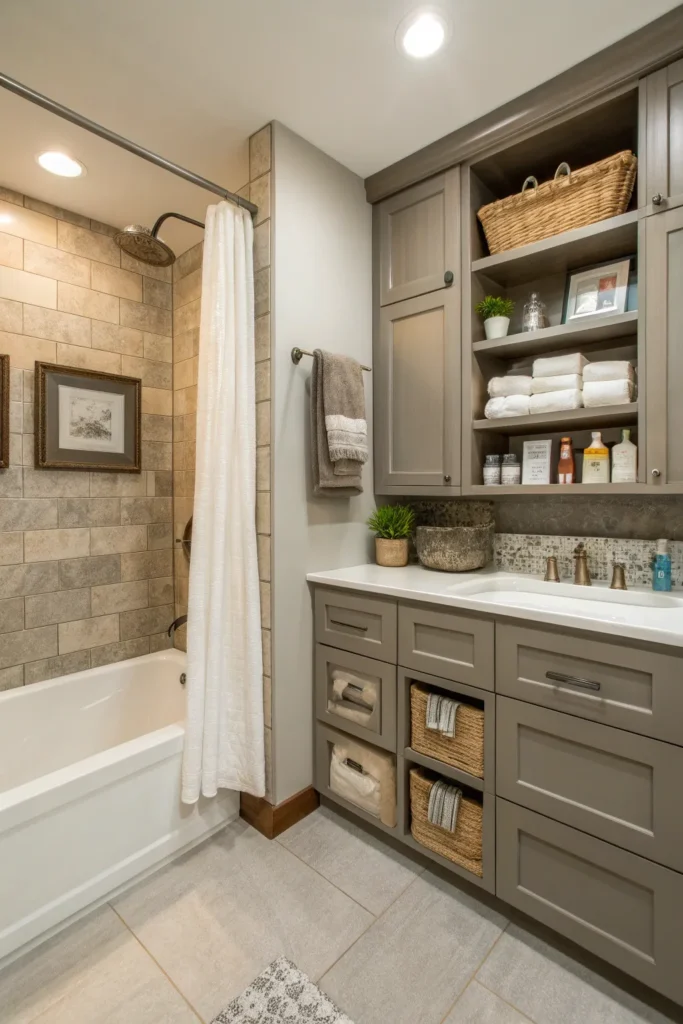 Create storage solutions at multiple heights to accommodate different family members, and use waterproof materials like solid surface or tile throughout storage areas. Install pull-out drawers within base areas for easy access to cleaning supplies, and include hooks and towel bars integrated into the design. Add interior lighting within storage areas for visibility, and ensure all storage elements coordinate with overall fixture finishes and colors.