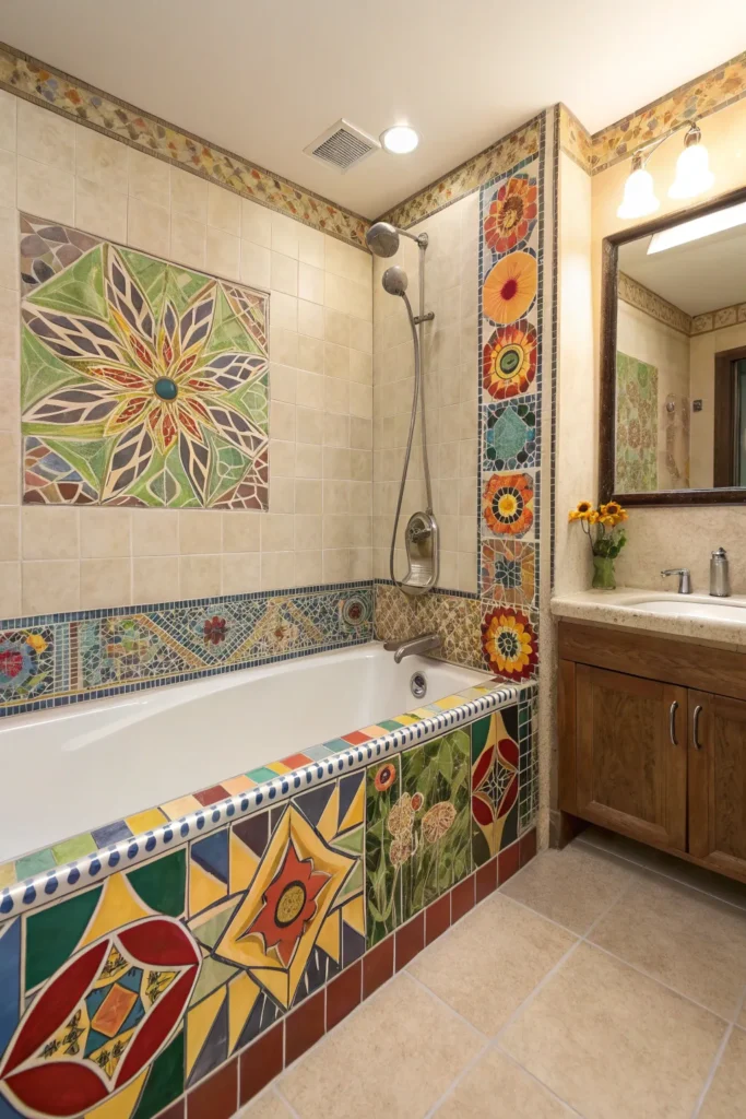 Transform a standard tub-shower combo into an artistic statement by incorporating colorful mosaic tile work that creates visual interest and personal expression while maintaining functionality and water resistance throughout the wet areas.