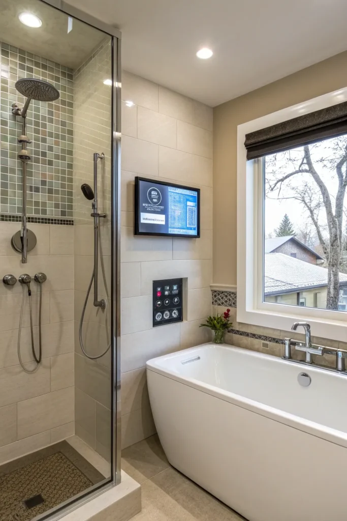Include features like automatic filling systems that maintain perfect temperature, overflow prevention systems, and smartphone app integration for remote operation. Add waterproof speakers and LED lighting systems that can be controlled through smart home platforms, and ensure all technology elements are properly waterproofed and professionally installed. Design interfaces to be intuitive for users of all ages while maintaining reliability over time.