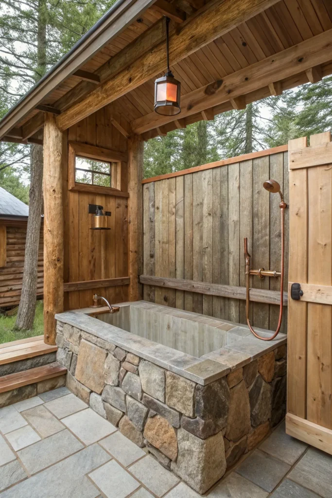 Create a cabin-inspired tub-shower combo using natural materials like reclaimed wood, natural stone, and copper fixtures that bring outdoor elements indoors while maintaining functionality and moisture resistance appropriate for bathroom environments.