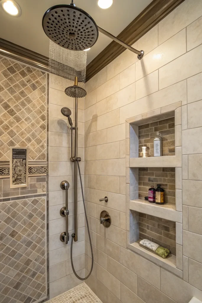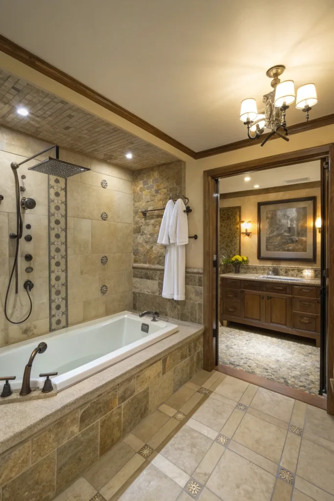 Install multiple shower heads including rainfall, body sprays, and handheld options with thermostatic mixing valves that maintain consistent temperatures throughout use. Add built-in seating, towel warming systems, and automatic ventilation that activates based on humidity levels. Include premium materials like natural stone, high-end tile work, and luxury fixture finishes that rival high-end hotel installations while maintaining residential practicality.
