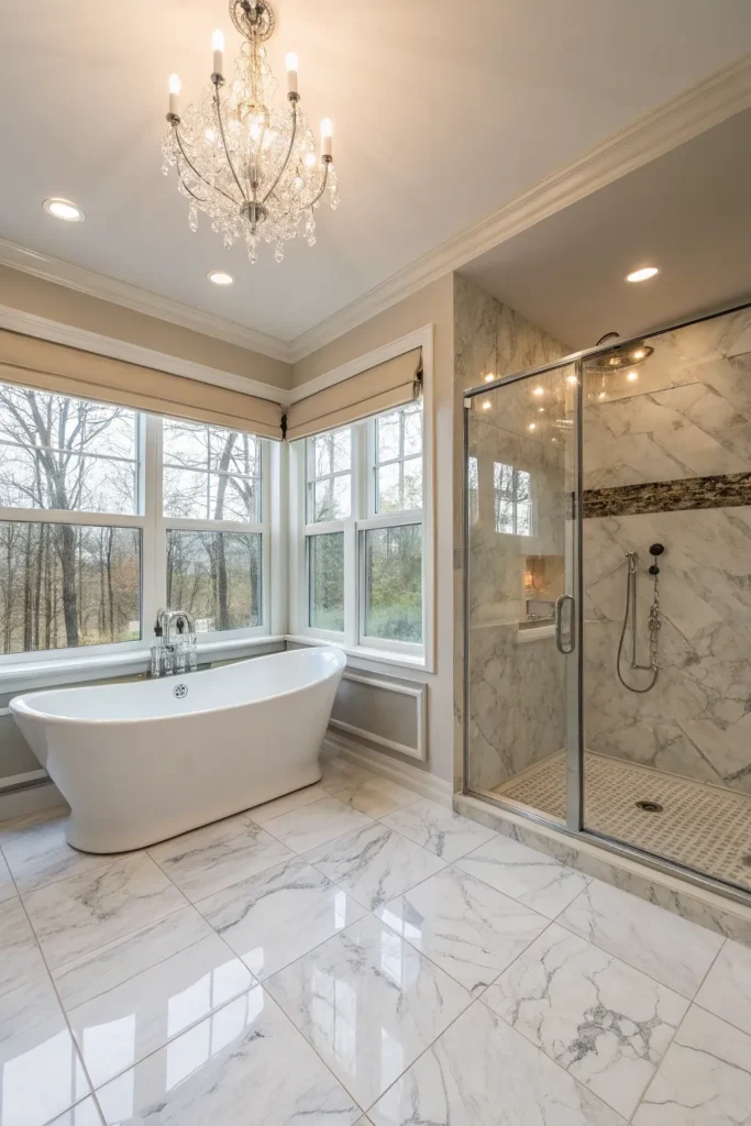 Install large-format marble-look porcelain tiles throughout both areas, creating visual continuity while providing water-resistant surfaces that require minimal maintenance. Add a statement chandelier centered above the tub area, complemented by recessed lighting within the shower enclosure. Include built-in seating within the shower area, and position the tub near a large window with privacy glass for natural light and outdoor views during relaxing soaks.