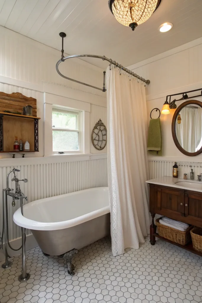 Transform a traditional clawfoot tub into a functional combo by installing a circular shower ring with wraparound curtain system, combining vintage charm with modern shower functionality while maintaining the tub’s architectural appeal as a bathroom centerpiece.