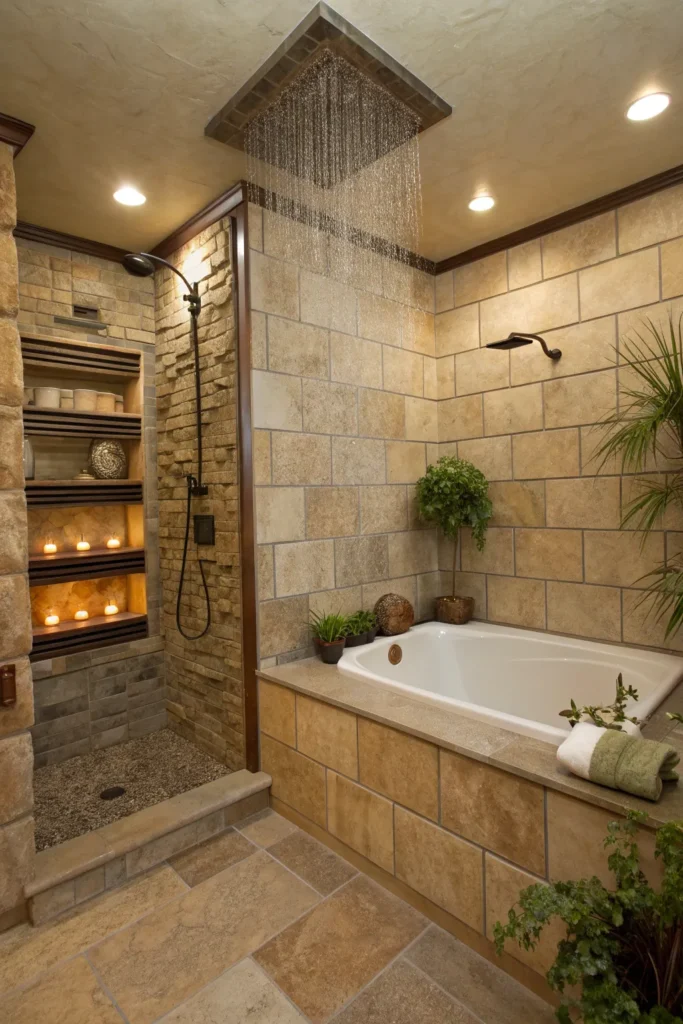 Design the surround using natural stone tiles or large-format porcelain with stone appearance, creating a serene backdrop that enhances the spa atmosphere. Add built-in seating both within and adjacent to the combo area, and install multiple shower controls that allow customization of water temperature and pressure. Include ambient lighting through LED strips behind floating shelves, and add plants that thrive in humid conditions for a natural spa feel.