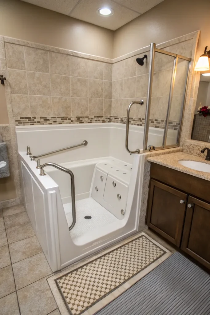 Install slip-resistant flooring throughout the wet area, using textured tiles that provide safety without compromising aesthetic appeal. Add fold-down seating that can be used during bathing or folded away when not needed, and include multiple grab bars in strategic locations that blend with the overall design. Use lever-style fixtures that are easy to operate, and ensure adequate lighting that eliminates shadows while providing safe navigation.