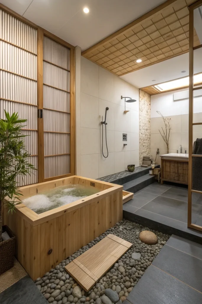 Use natural wood accents like teak or cedar that can withstand moisture while adding warmth to the space, complemented by smooth river rocks and bamboo accessories. Install indirect lighting that creates calm ambiance, and include a small wooden stool and natural fiber bath mat that enhance the authentic Japanese aesthetic. Add a single statement plant like a small bamboo arrangement, and maintain clear sight lines throughout the space.