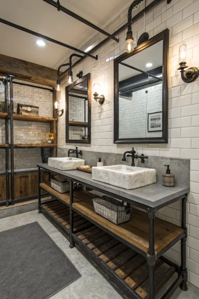 Install concrete or concrete-look countertops and flooring that complement the industrial theme while providing durability and water resistance. Add Edison bulb lighting fixtures and metal frame mirrors that enhance the urban loft atmosphere. Include open shelving made from reclaimed wood and metal brackets, and use accessories in materials like galvanized metal, leather, and dark ceramics that support the industrial aesthetic.