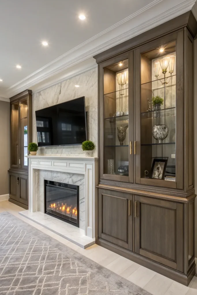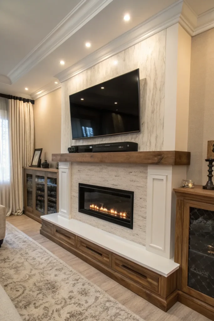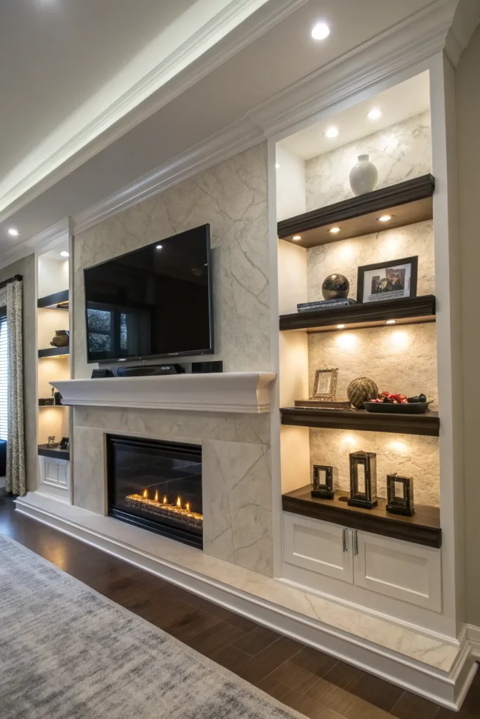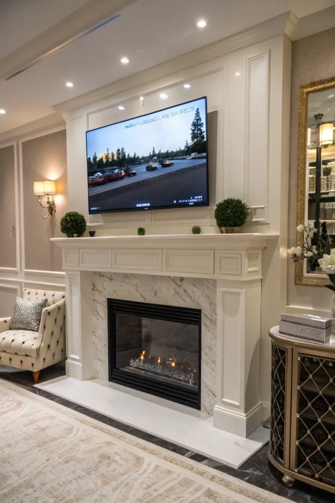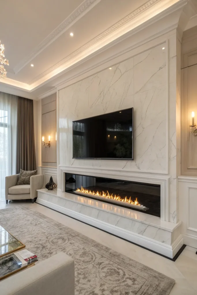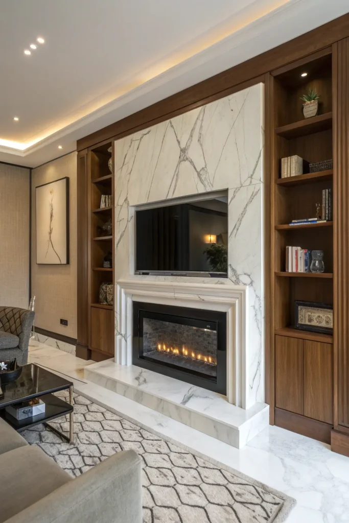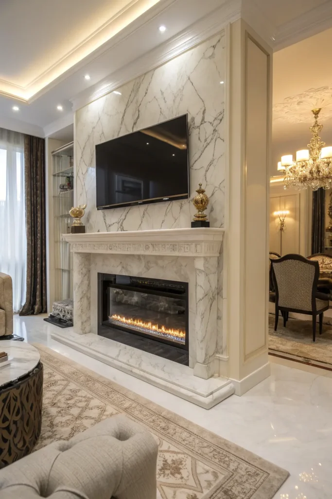 A marble-clad fireplace with a TV above instantly feels upscale and elegant. Choose veined marble in ivory or gray for a refined designer vibe.
