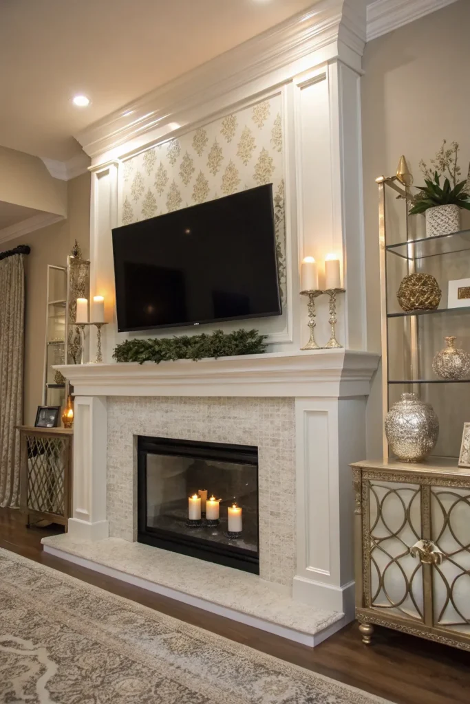 If your TV sits high above the fireplace, use tall vases, candlesticks, or sculptures on the mantel to bridge the visual gap. This creates balance and prevents the TV from feeling isolated.