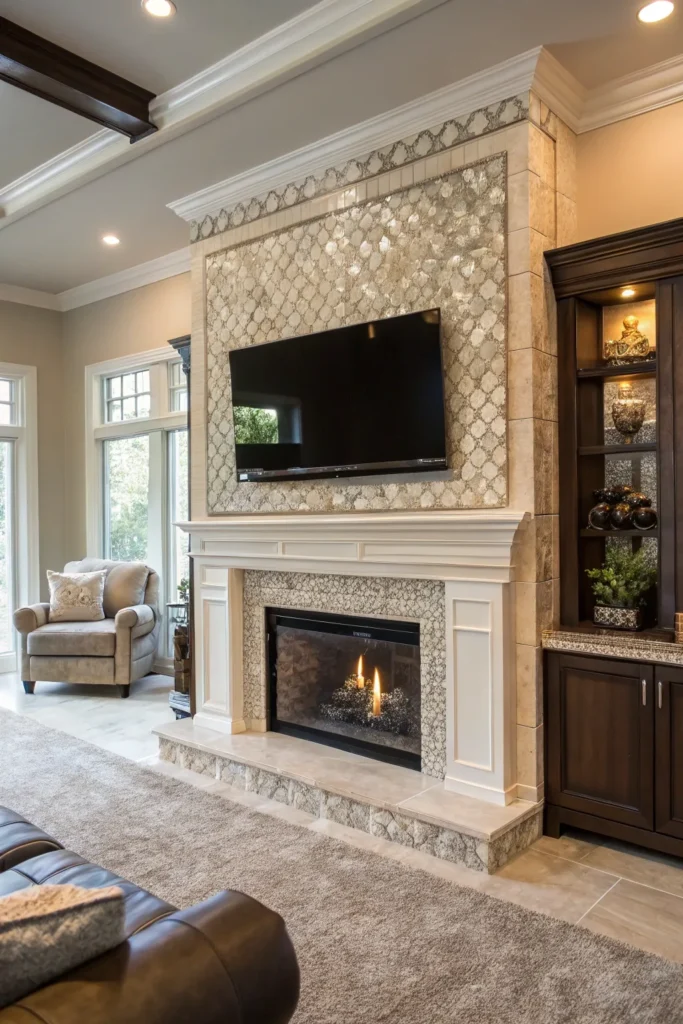 Cover the fireplace wall with textured tile like patterned cement, vertical slats, or zellige tile. The TV above becomes part of a stunning feature wall.