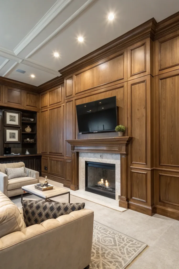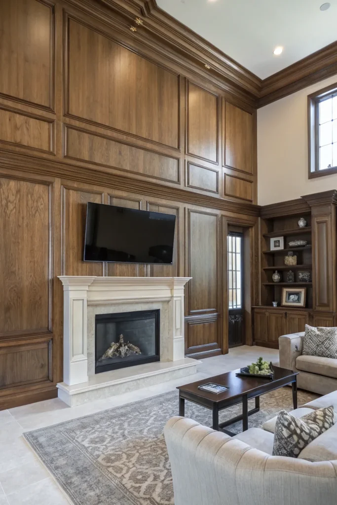 Run wood paneling from the mantel upward behind the TV to add warmth and visual impact. Natural oak or light walnut keeps the space modern and inviting.