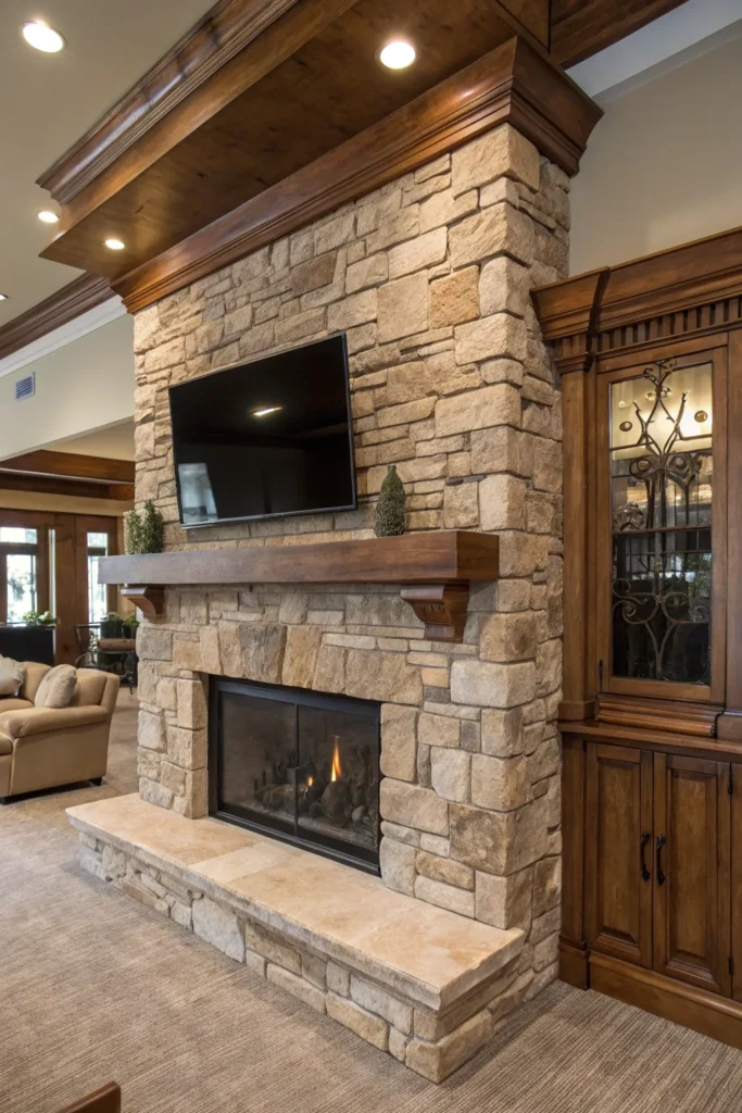 A natural stone fireplace paired with a thick reclaimed wood mantel adds beautiful texture and warmth. Mount the TV just above the mantel so the two elements feel connected.