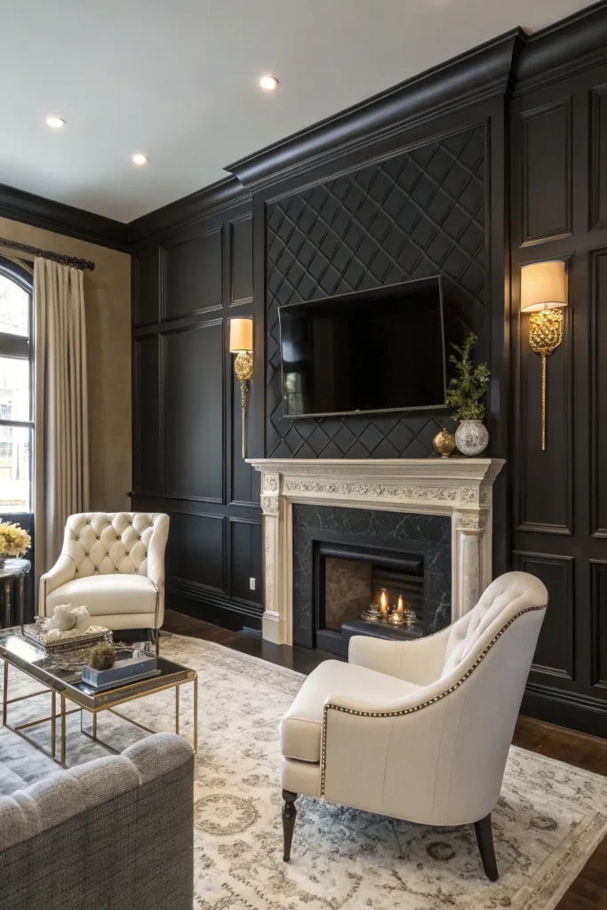 Paint the fireplace wall a deep tone like moody navy, charcoal, or forest green to make the space feel dramatic and cozy. The TV blends better into a dark background, reducing visual distraction.